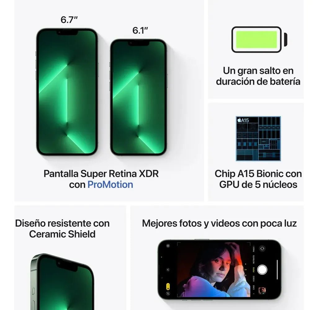 Vive la experiencia profesional y elegante del iPhone 13 Pro 1TB en color Verde Alpino, un dispositivo que combina rendimiento de alto nivel, diseño sofisticado y almacenamiento masivo. Con el poderoso chip A15 Bionic, una pantalla Super Retina XDR de 120 Hz y su sistema de triple cámara con modo cinematográfico, captura fotos y videos con una calidad inigualable.