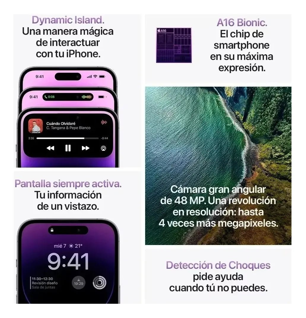 El iPhone 14 Pro de 1TB en color Plata redefine el lujo y el rendimiento. Con su chip A16 Bionic ultrarrápido, pantalla Super Retina XDR ProMotion y el innovador Dynamic Island, este modelo ofrece una experiencia fluida y profesional. Su sistema de cámaras Pro de 48 MP captura imágenes impresionantes con detalle y precisión, ideal para fotografÃa y video 4K.