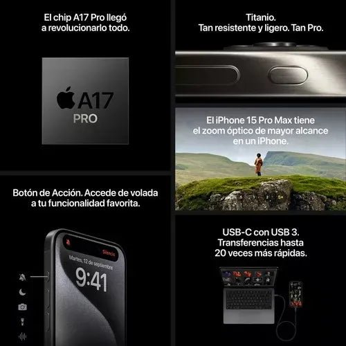 El iPhone 15 Pro Max de 256GB en color Titanio Negro redefine la potencia y la elegancia. Fabricado con titanio de grado aeroespacial, es más ligero, resistente y sofisticado que nunca. Su chip A17 Pro ofrece un rendimiento de otro nivel para gaming, multitarea y fotografÃa profesional.