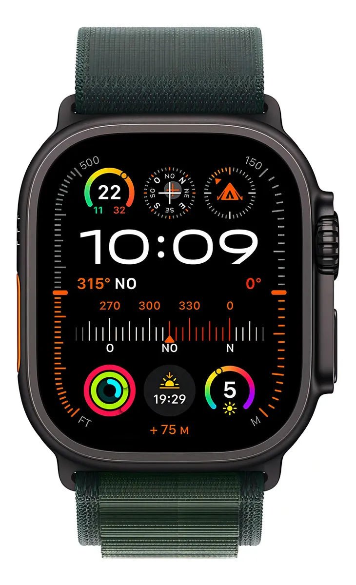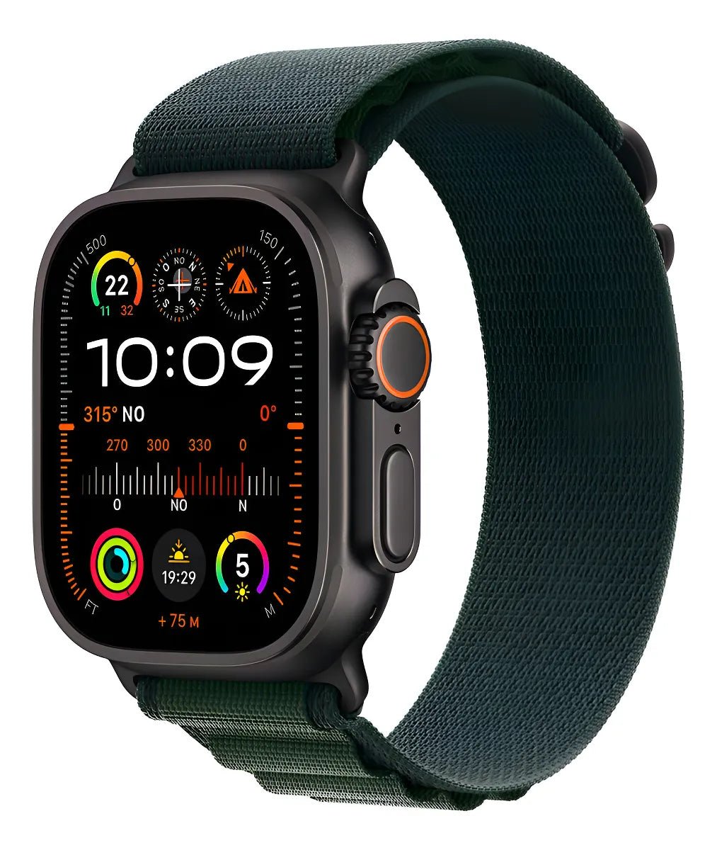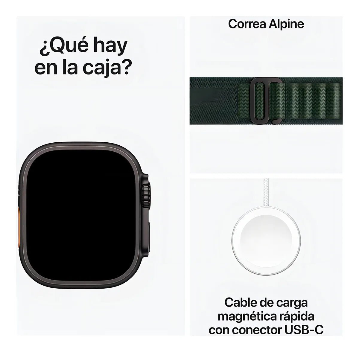 Descubre la potencia del Apple Watch Ultra 2, diseñado para quienes exigen rendimiento, resistencia y estilo premium. Su caja de titanio negro de 49 mm ofrece durabilidad extrema con un acabado elegante, mientras que la correa Alpine en color verde oscuro aporta un toque aventurero y moderno.