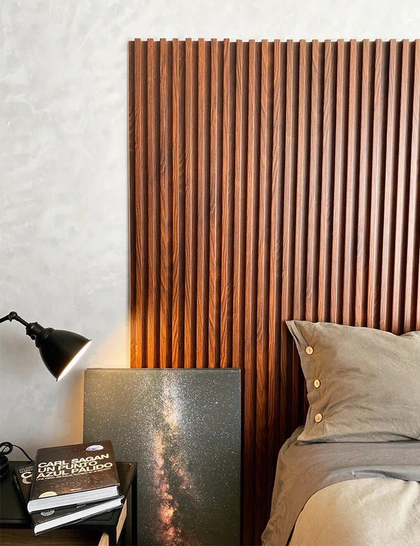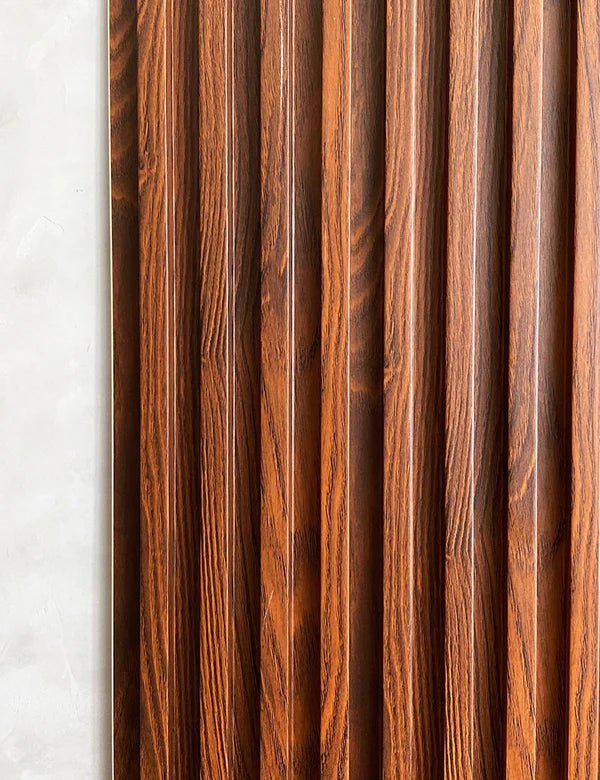 Lambrín Interior WIDE Color Parota Gold. El panel WPC para interiores está compuesto por un 60% de resina de madera y un 40% de PVC, y está acabado con un revestimiento de impresión texturizado que le confiere el aspecto de la madera.