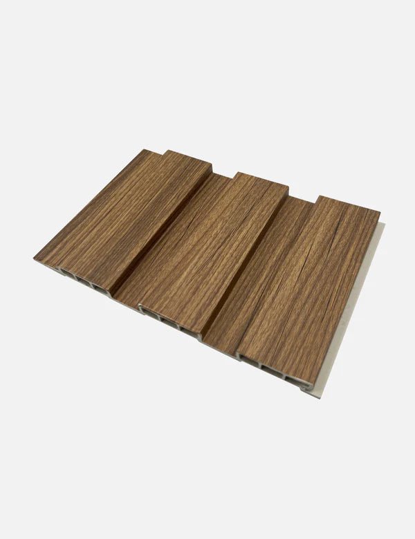 Lambrín Interior WIDE Color Nogal Claro. El panel WPC para interiores está compuesto por un 60% de resina de madera y un 40% de PVC, y está acabado con un revestimiento de impresión texturizado que le confiere el aspecto de la madera.
