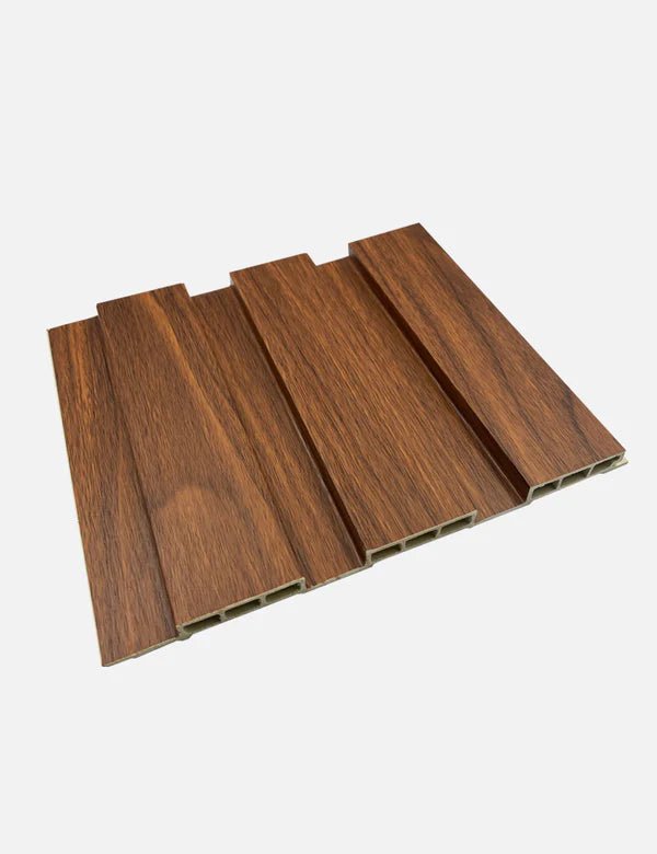 Lambrín Interior WIDE Color Parota Clásico. El panel WPC para interiores está compuesto por un 60% de resina de madera y un 40% de PVC, y está acabado con un revestimiento de impresión texturizado que le confiere el aspecto de la madera.
